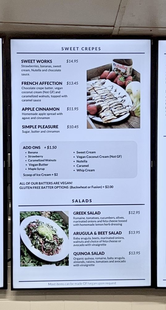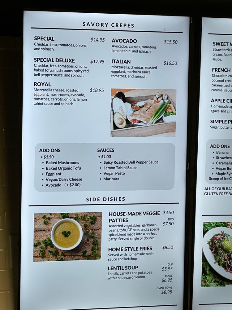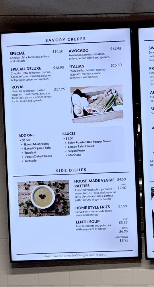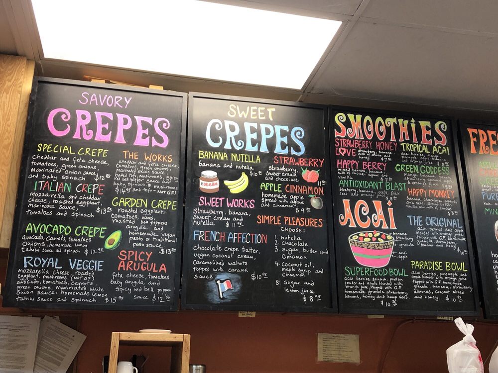The menu features an impressive selection of savory and sweet crepes, such as the Special Deluxe and the Royal Crepe, bursting with flavor and creativity. For health enthusiasts, the extensive vegan and vegetarian options are perfect, as noted by satisfied customers raving about the Green Goddess Smoothie and house-made falafels.